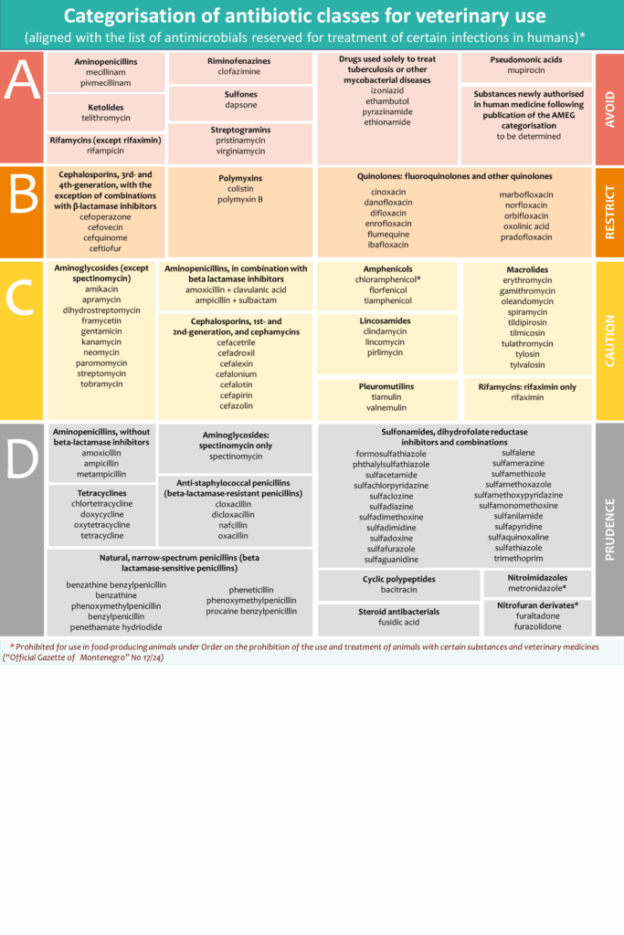 Category A: “Avoid” includes antibiotics that are currently not authorised in veterinary medicine in the European Union (EU), or Montenegro. These medicines should not be used in food-producing animals, while it is only under exceptional circumstances that they may be given to individual companion animals;